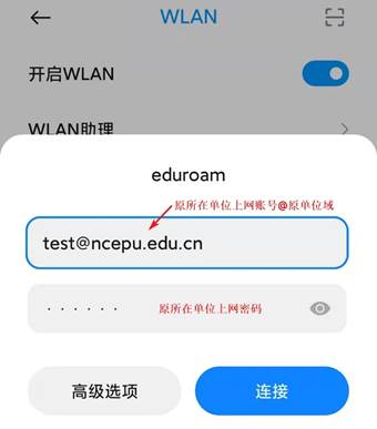WLAN设置里连接SSID为eduroam的无线网络,输入正确的用户名和密码后,点击“连接”。