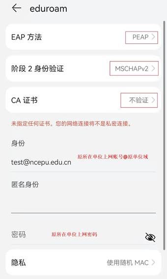 WLAN设置里连接SSID为eduroam的无线网络,在详细设置页面中,EAP方法选择“PEAP”,阶段2身份验证选择“MSCHAPV2”,CA证书选择“不验证”,然后输入正确的用户名和密码,点击“连接”。