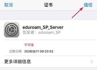 WLAN设置里连接SSID为eduroam的无线网络,输入正确的用户名和密码,点击“加入”,如果提示证书“不可信”,直接点击“信任”即可。